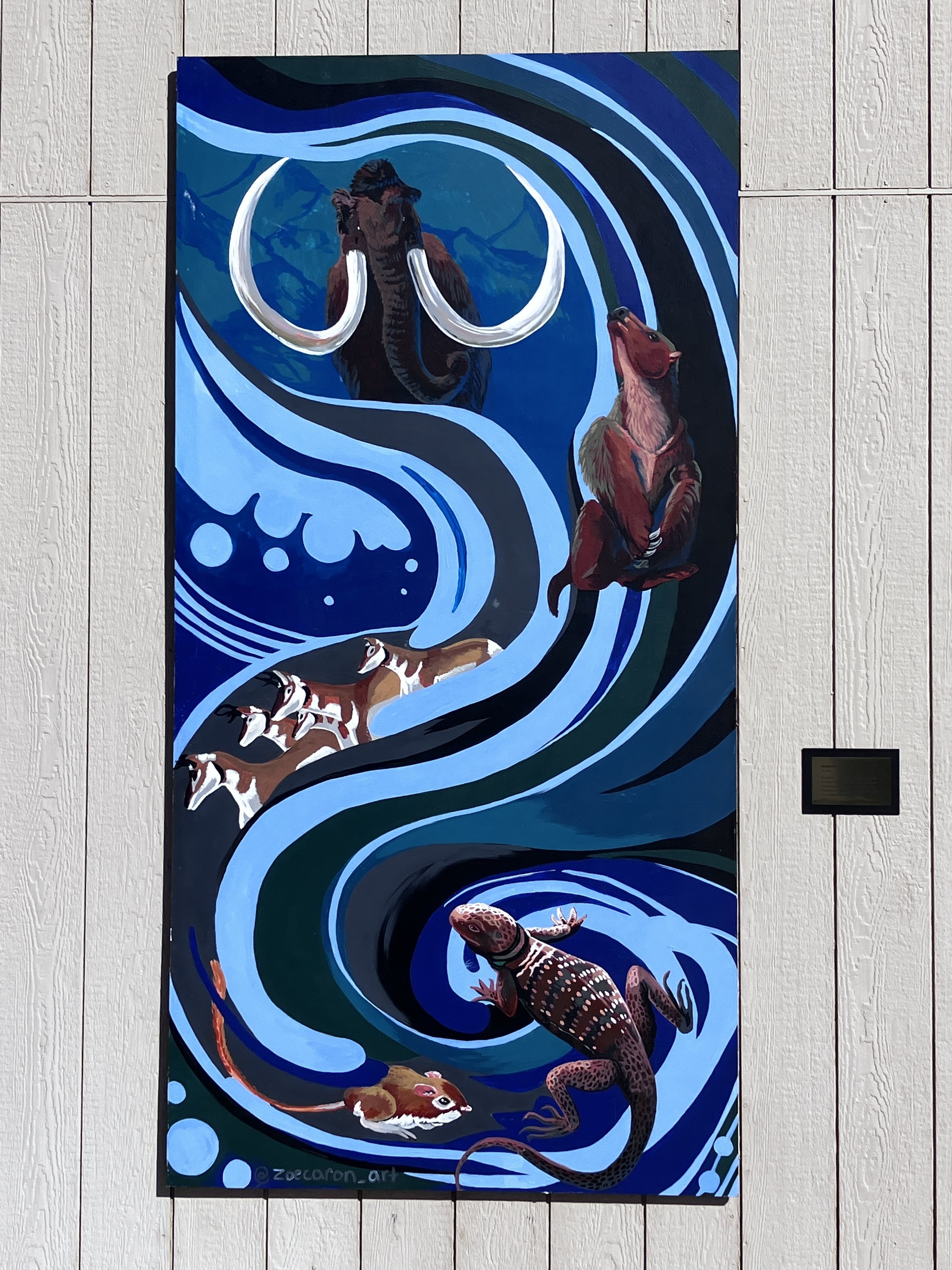 Swirling water represents ancient Lake Lahontan and the life it supported. Gerlach was once underwater. A mammoth and Shasta ground sloth weave through to modern times to a small pronghorn herd, Great Basin collared lizard, and kangaroo rat. Modern pronghorn are relics of larger herds that once roamed the area. Lizards and kangaroo rat populations likely expanded as the land became more arid. “My artwork is a celebration of all things living. Through crisp lines and natural patterns overlaid on backdrops of intense abstractions, I express the natural world’s flow and energy.”